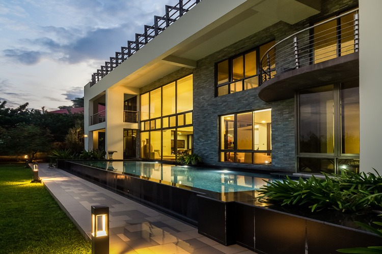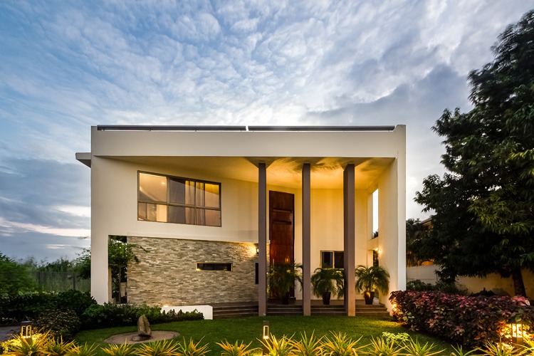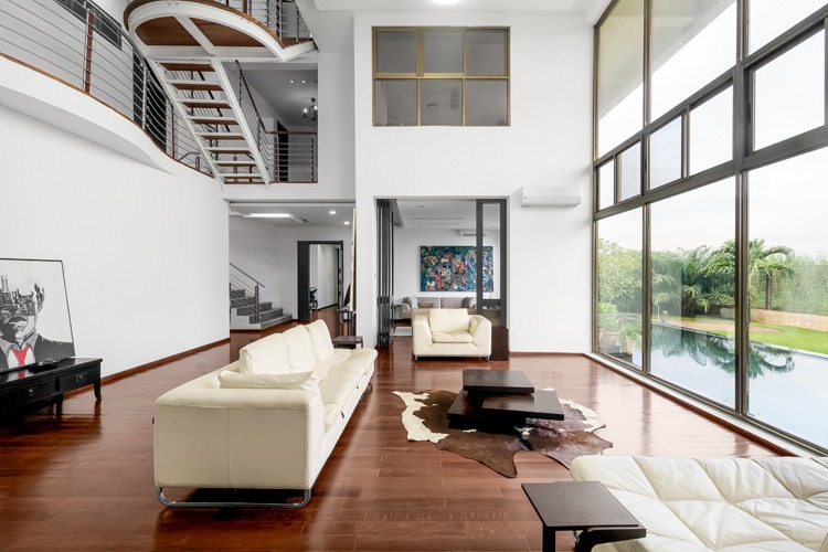 Aihie Villa is located in Victoria Garden City which is a gated community in the Ajah area of Lagos State. The front facade of the building reflects the contemporary vibe of the home with its geometric forms and the positioning of different sizes of windows. The warm color scheme with its natural elements and textures harmonizes the building with its natural surrounding giving it a picturesque appeal.