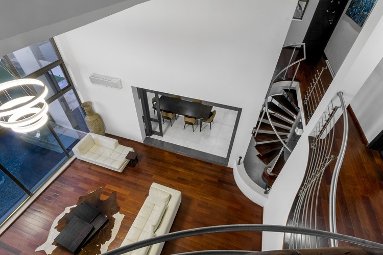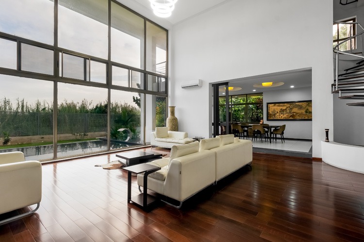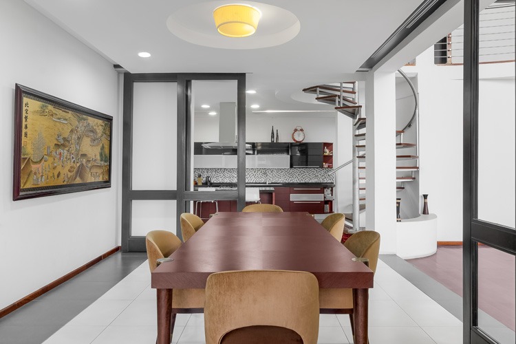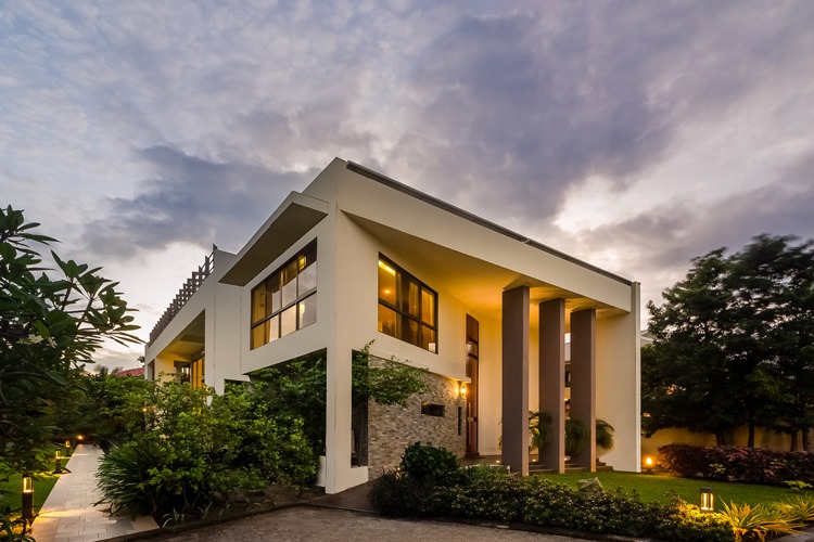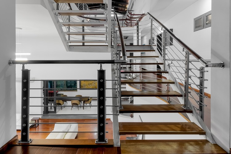 The elegant finishes comprise external porcelain floor tiles, a combination of stone and concrete plastered wall with weather shield earth color paint palette, impressionable double height hard wood doors topped with Aluminum and wood framed roofing. It further includes aluminum framed glazing, stainless steel external handrails, and several steel and wood finish interior details. The stair structure is a tactile composition of floating stair threads, steel stinger and wooden top rails.