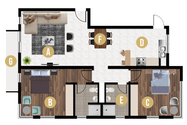 The two bedrooms apartment come in two different types. Type A (113 sqm) and Type B (108 sqm & 113sqm). Thoughtfully laid out with a spacious living and dining space, with an open kitchen plan that can be walled off if desired. The two bedrooms are en-suite with generous wardrobe space.