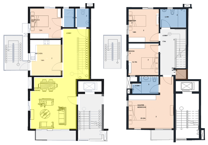 The Toby Apartment is a Four Bedroom Maisonette, with the lower level measuring 92 Square Meters (92 Sqm) and the upper level measuring 88 Square Meters (88 Sqm).